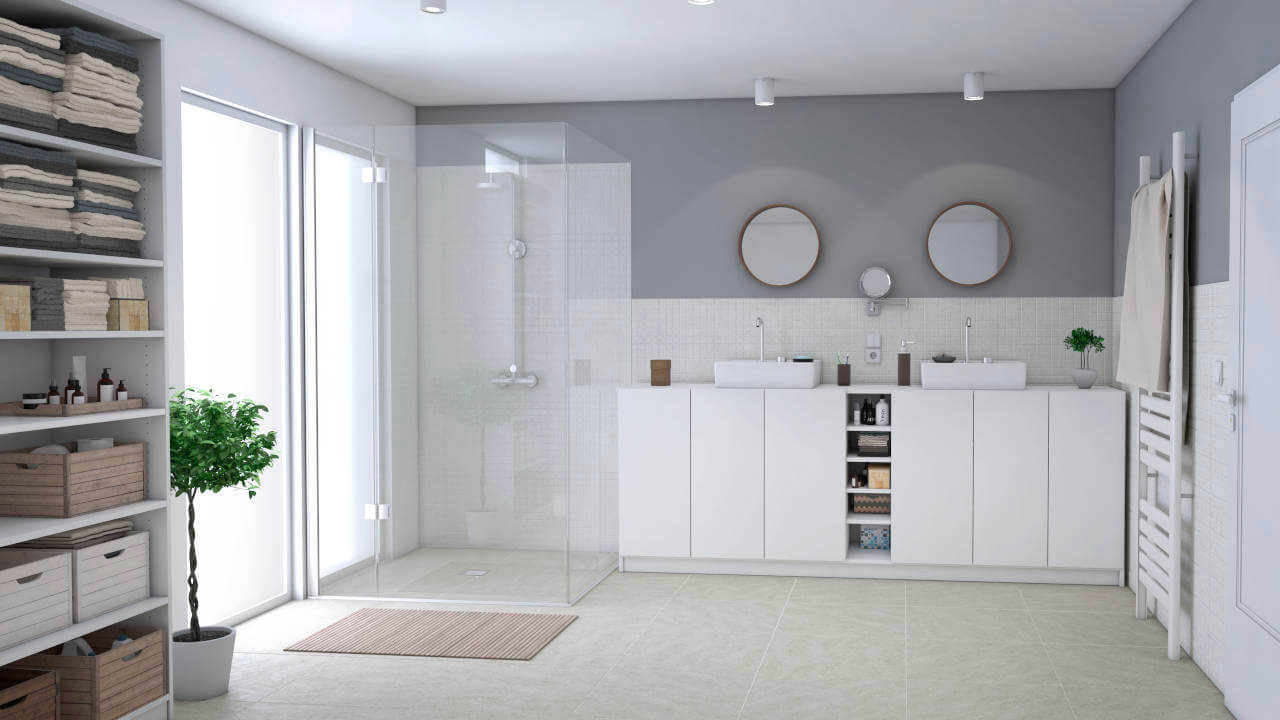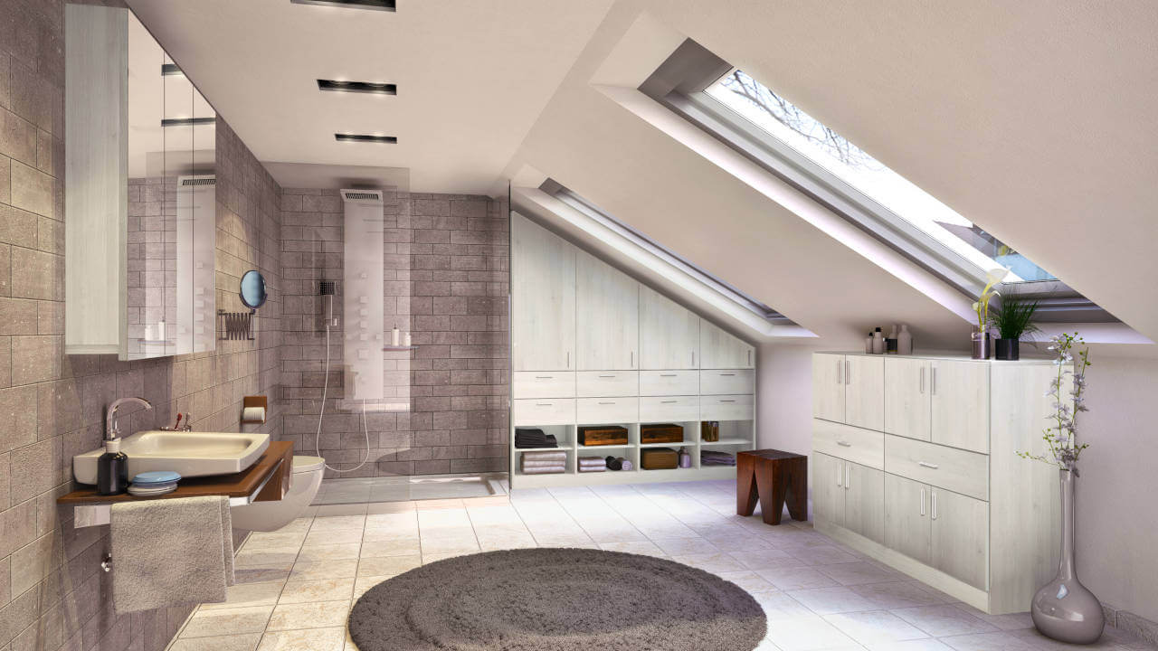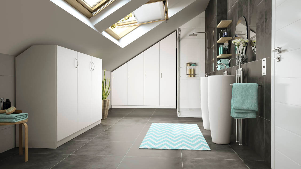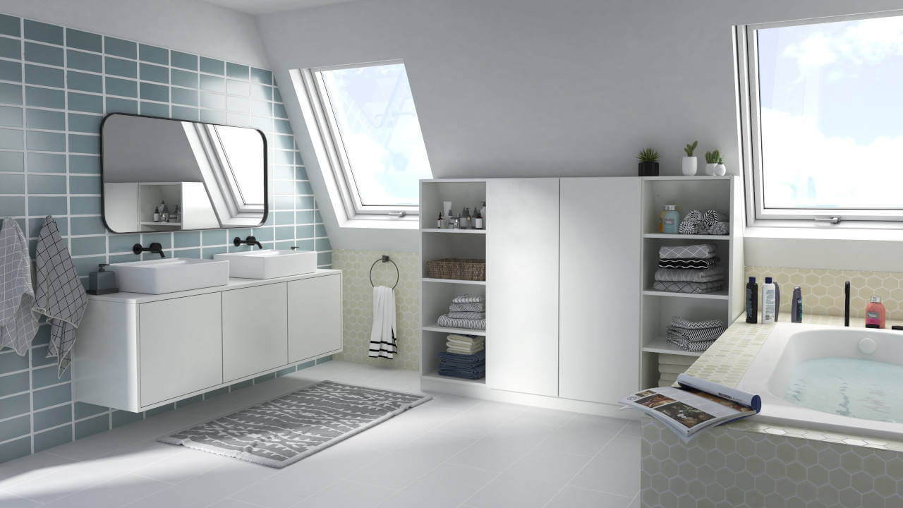 Også i badeværelser med skråvæg kan den eksisterende plads forvandles perfekt til opbevaringsplads. De to skabe til skråvæg rummer masser af plads til håndklæder, kosmetik, badekåber og mange andre ting. I enkelt hvidt dekor giver de rummet en vis lethed.