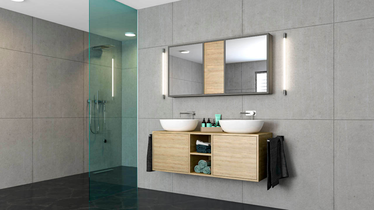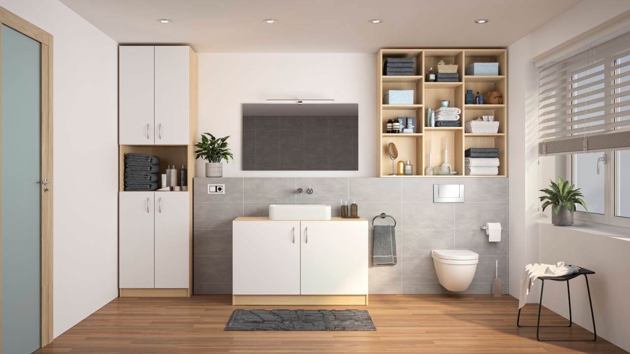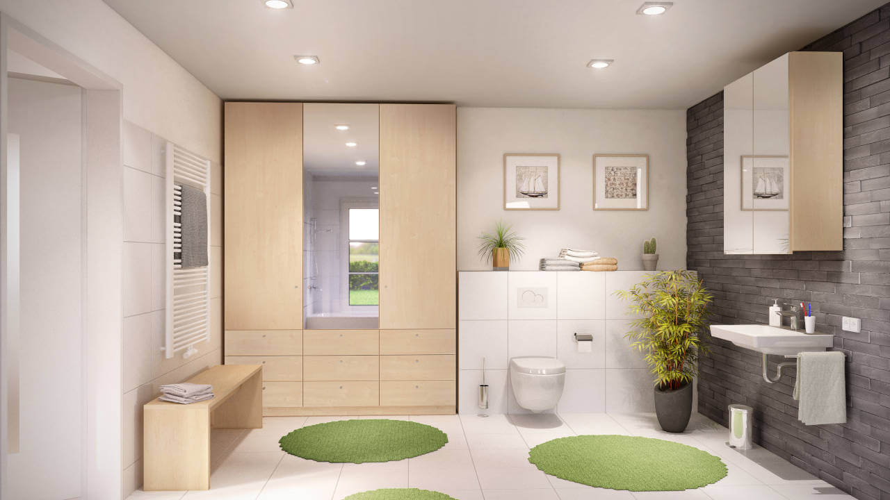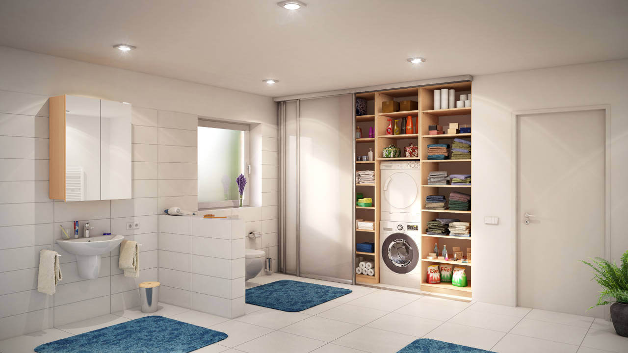 De tre reoler i nichen giver en praktisk udnyttelse af opbevaringspladsen på badeværelset. Vaskemaskine og tørretumbler kan integreres perfekt i reolsystemet. Det trefløjede skydedørsanlæg lukker reolsystemet millimeterpræcist. Væghængeskabet med spejl i bøgedekor supplerer reolsystemet og fuldender helhedsindtrykket.