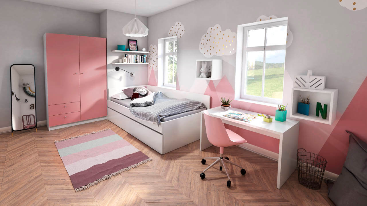 Soveområdet adskilles elegant fra resten af børneværelset med reolen som rumdeler. Skabet med skrå bagkant og reolen, der bruges som rumdeler, giver masser af opbevaringsplads til bøger, spil og andre ting. Alle møbler i det enkle hvide dekor passer harmonisk sammen.