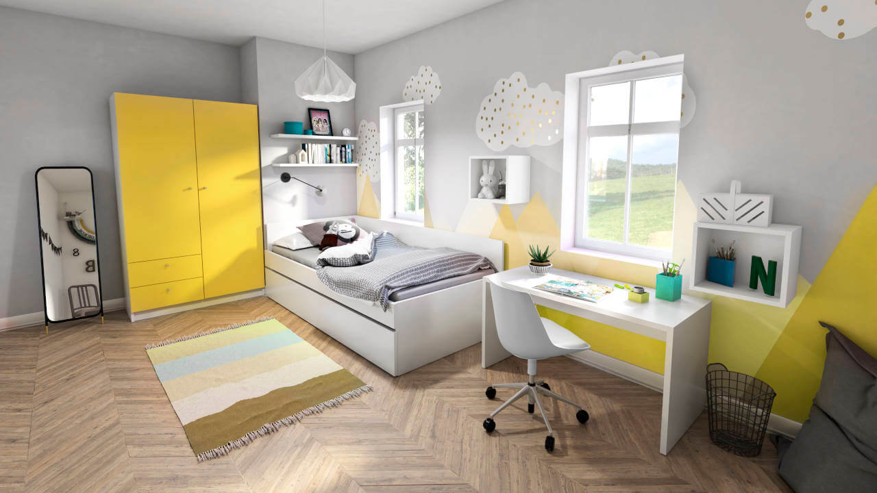 I dette børneværelse er overnattende gæster altid velkomne. Med den udklappelige sovesofa fra kollektionen Hamburg kan der med et praktisk greb på få minutter skabes en ekstra soveplads. Takket være fjederribberne er sofaen velegnet som permanent soveplads. Den hvide reol med skrå side udnytter den tilgængelige plads under den skrå loftsvæg optimalt.