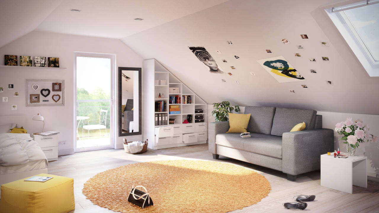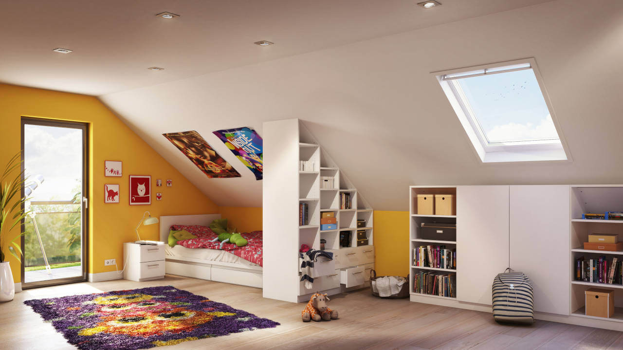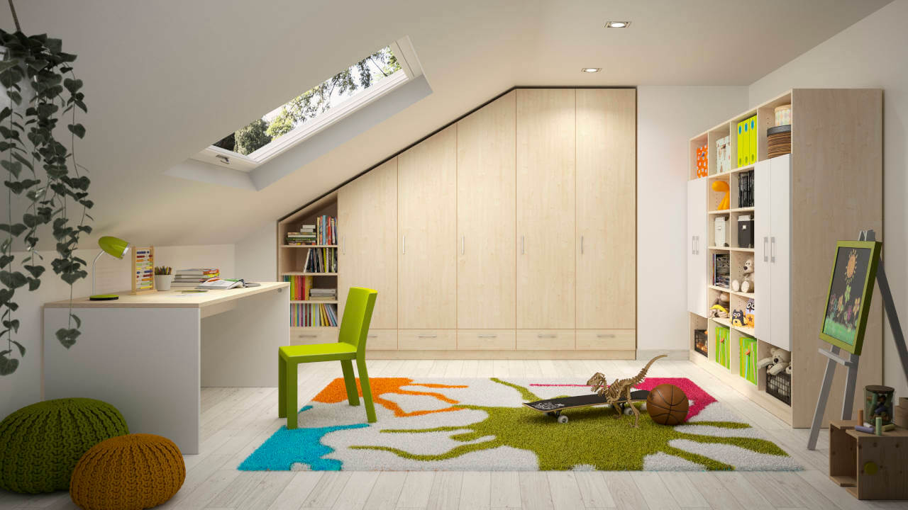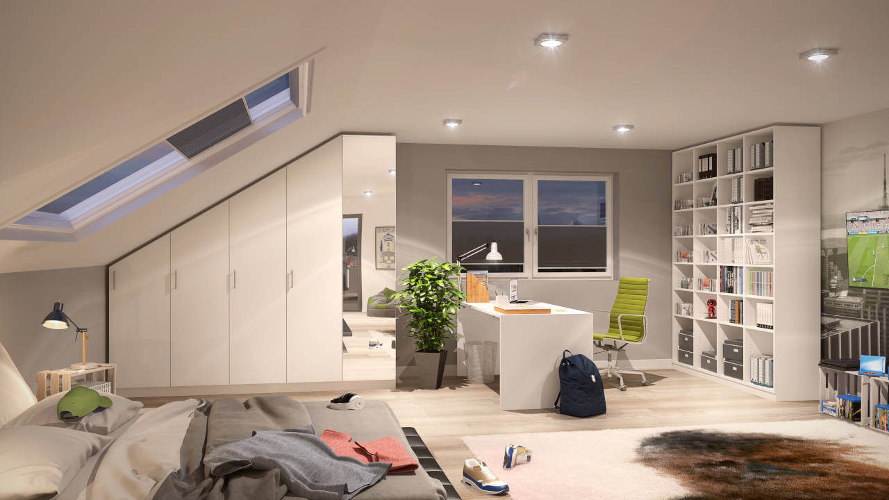 Mange kan kun drømme om et så praktisk og flot indrettet ungdomsværelse. Skabet med skrå side passer perfekt under skråvæggen. Med skrivebordet model "Lisa" opdeles rummet funktionelt i bolig- og arbejdsområde. I den loftshøje reol er der plads til ringbind, skolesager, bøger og meget mere.
