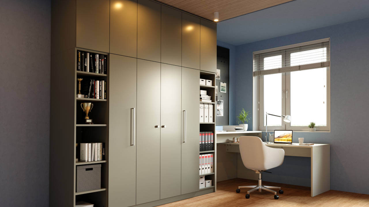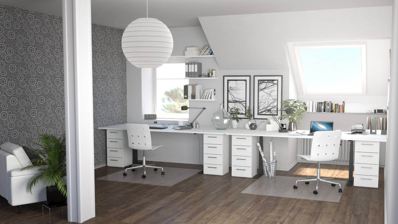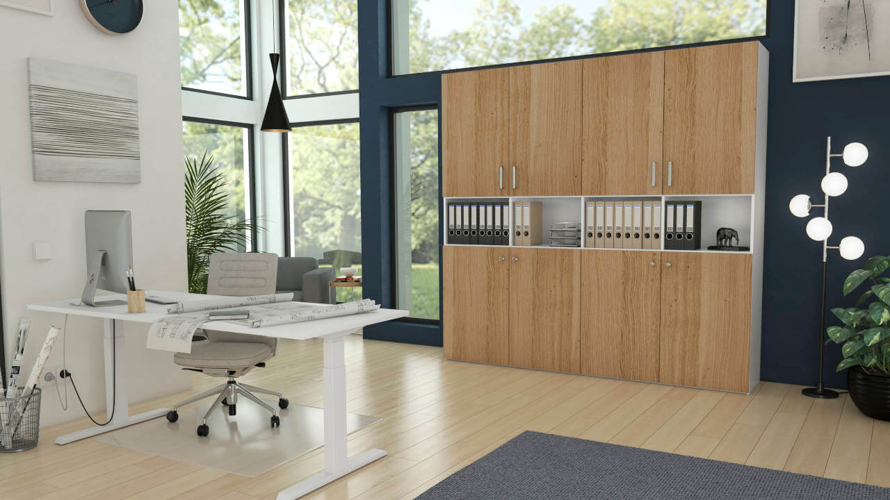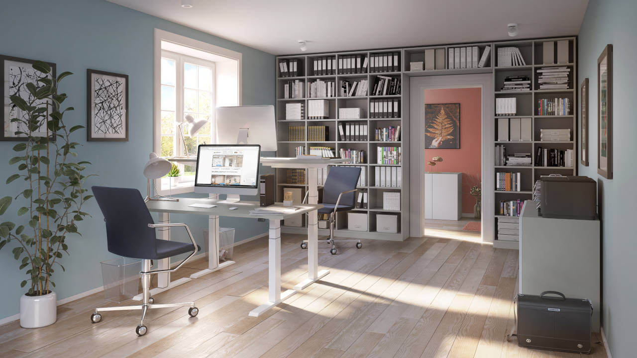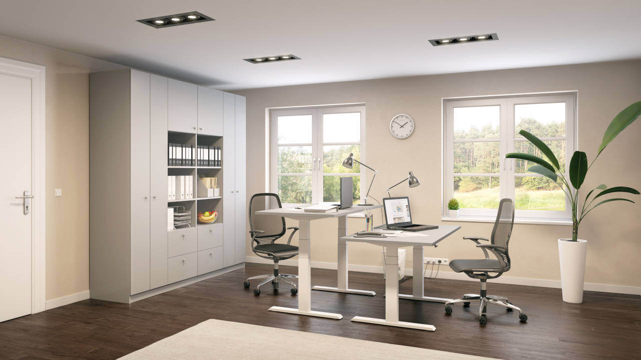 På et perfekt udstyret hjemmekontor arbejder man særligt godt. De højdejusterbare skriveborde giver mulighed for varieret arbejde i siddende og stående stilling og kan tilpasses præcist til den enkelte kropshøjde. Den store reolvæg og skænken tilbyder masser af opbevaringsplads til alle vigtige dokumenter.