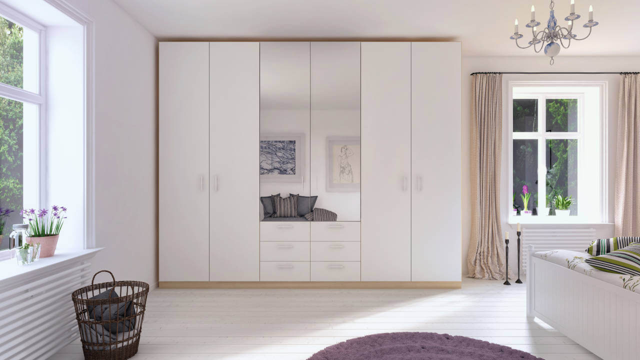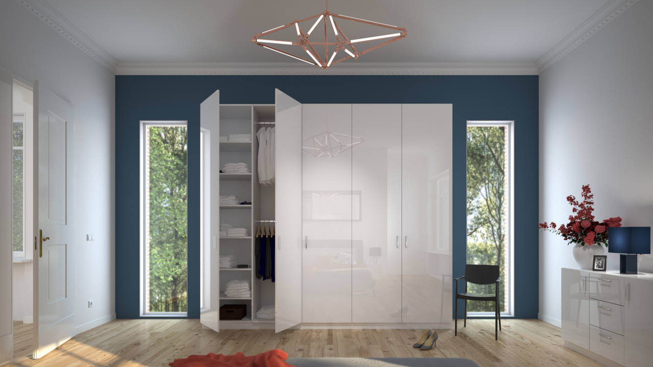 Med dette smukke garderobeskab i dekoren hvid højglans får du dit soveværelse til at stråle. Denne meget eftertragtede dekor giver ethvert soveværelse et moderne og elegant udtryk. I det rummeligt konfigurerede skab og den matchende kommode kan al beklædning opbevares overskueligt.