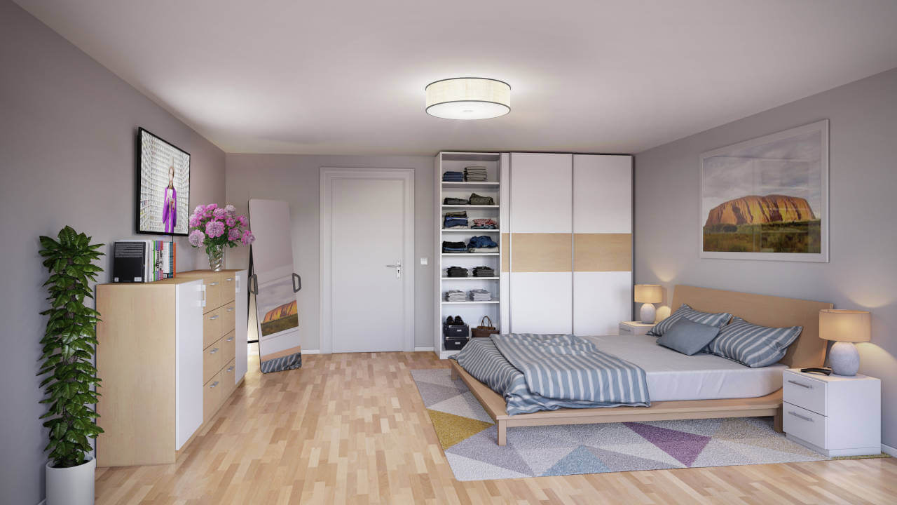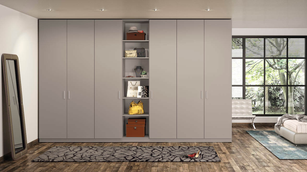 Med talrige garderobestænger, hylder og indvendige skuffer er dette garderobeskab et sandt opbevaringsmirakel! Den jordnære dekor stengrå skiller sig ud fra de klassiske dekorer og giver soveværelset et elegant udtryk.