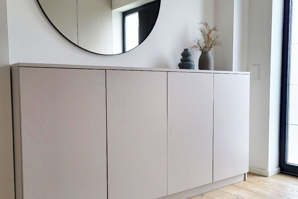 Skænke med skrå bagvæg giver ekstra opbevaringsplads