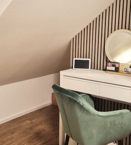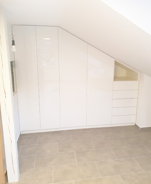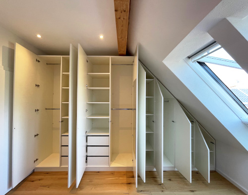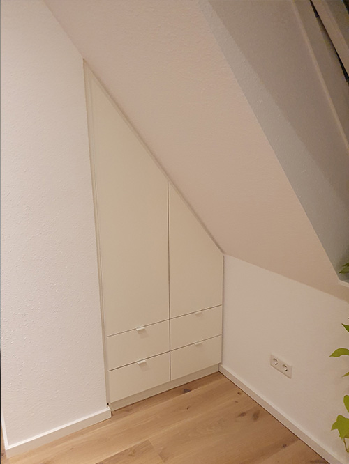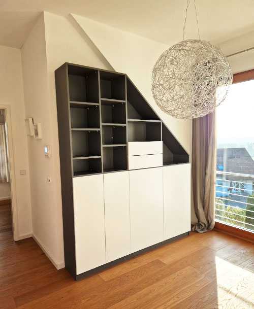 At bo under taget har en helt særlig charme, men byder ofte også på særlige udfordringer. Ofte mangler der opbevaringsplads, og mange hjørner og nicher forbliver ubrugte på grund af rummets vanskelige udformning. Med vores skræddersyede møbler kan du også overvinde denne indretningsudfordring.