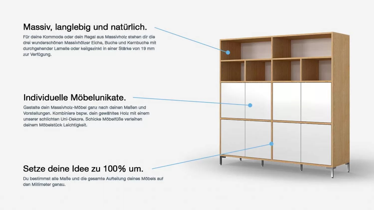 Notre configurateur en ligne vous permettra de réaliser vos idées avec plaisir. Déterminez vous-même la taille de vos meubles de rêve, les extras que vous préférez et les autres caractéristiques que vous souhaitez. Vous disposez d’un large choix de possibilités pour la conception optique. Que le lowboard soit entièrement blanc ou combiné avec d’autres décors, cela dépend de vous, car tous les meubles sont fabriqués sur mesure. Si vous souhaitez aussi tenir les décors en main et comparer chez vous, nous vous convaincrons volontiers de la qualité supérieure et vous enverrons une sélection d’échantillons. Soyez créatif et configurez facilement en quelques étapes vos meubles individuels qui correspondent exactement à vos idées et à vos exigences. Le configurateur vous guide systématiquement vers votre destination. Si vous avez besoin d’aide pour la planification, nous serons heureux de vous conseiller sans engagement par téléphone ou par e-mail et nous vous attendons!